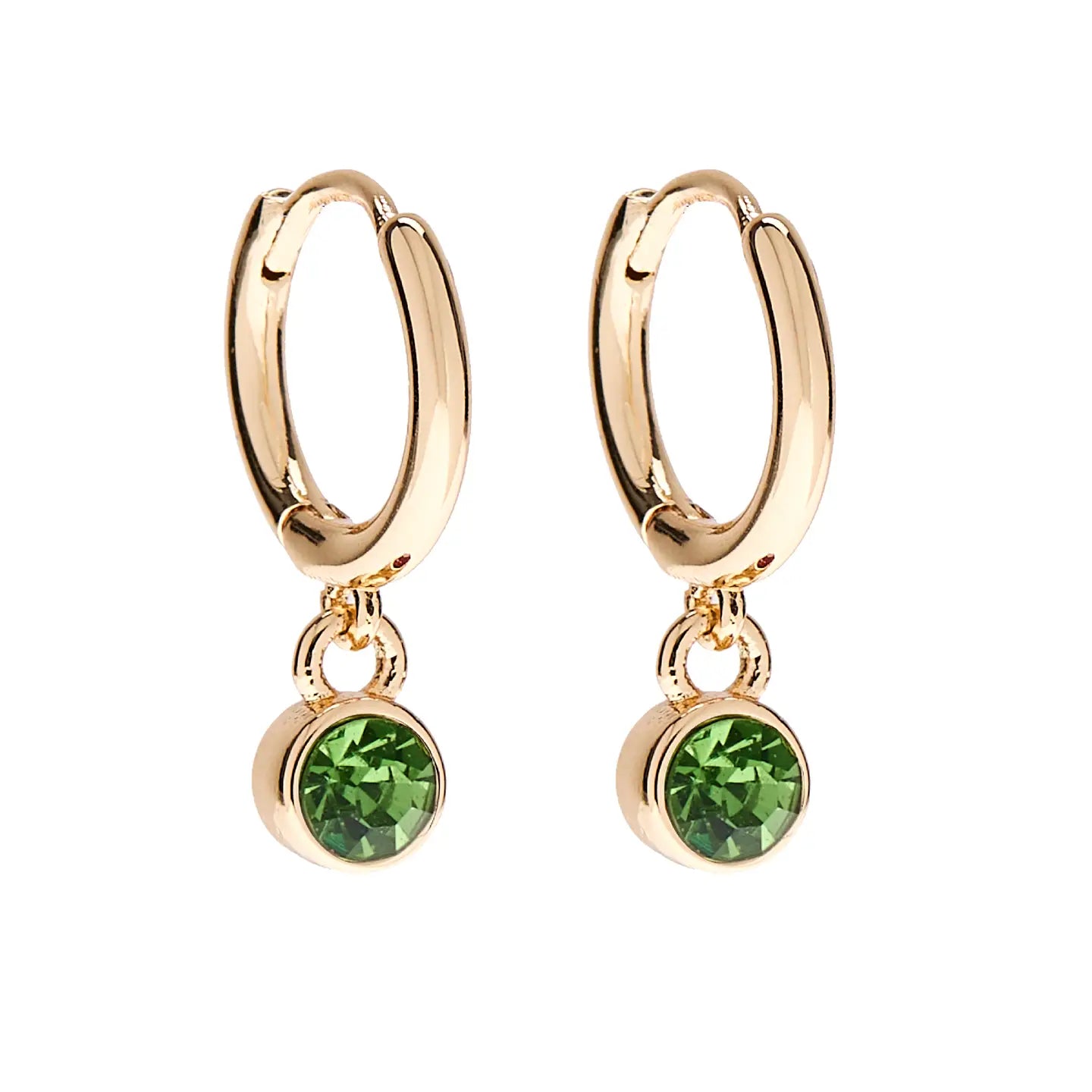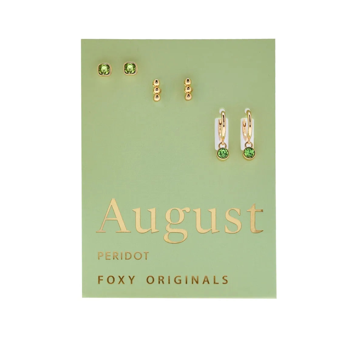 The August Birthstone Earrings showcase delicate huggie hoops with a dangling peridot-toned stone that represents beauty, matching cushion stone studs, and a gold plated triple dot bar.