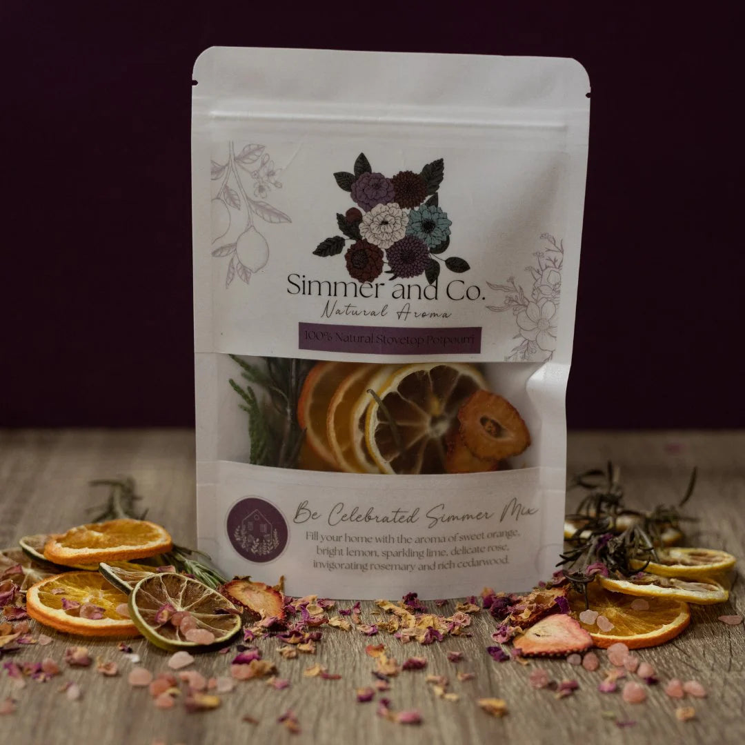 Our Be Celebrate Simmer Mix is more than just a stovetop potpourri kit – it's a symphony of scents that naturally fills your home with delightful aromas. Sweet Orange and Bright Lemon dance harmoniously, joined by Sparkling Strawberry for a touch of sweetness. Delicate Rose adds its floral charm, while Invigorating Rosemary brings a refreshing twist. And as the finale, Warm Cedarwood wraps you in a cozy embrace.