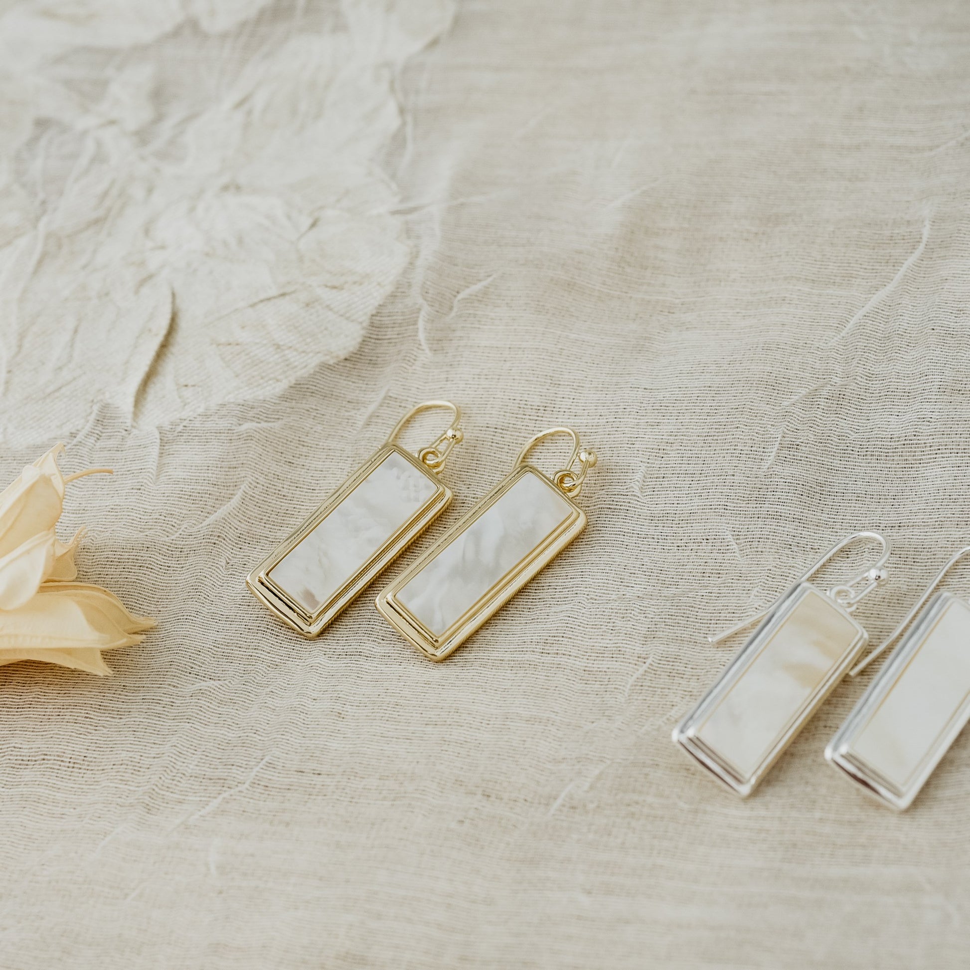 Details: approx. 1.5" long from the top of hoop - made with mother of pearl - silver or gold plated - hypoallergenic, nickel/lead free - anti-tarnish coated