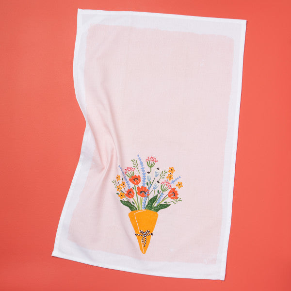 Cheers! Hooray! Oh happy day! A bright and cheery bouquet brings a sense of celebration to the kitchen. Featuring an embroidered design and sweet string bow detail, this cotton dishtowel brings something extra special to the heart of the home.